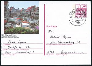 3869 | 12 € | POSTLEITRAUM 7000 (OHNE STUTTGART) : 7060 SCHORNDORF,WÜRTT 1/ x 1967 (11.12.) 1K-Segment auf ortsgleicher BiP 60 Pf. Burgen: 7080 Schorndorf, Württ... Geburtsort Gottlieb Daimlers , Bedarfs-Kt., seltene Kombination! (Mi.P 138/r 6-94) | ![]() | |