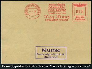 3878 | 35 € | POSTLEITRAUM 7000 (OHNE STUTTGART) : SCHWÄBISCH GMÜND 1/ Trocken-Gemüse/ Getrocknete Pilze../ Max Munz/ 1939 (7.7.) AFS-Musterabdruck Francotyp "Reichsadler" , glasklar gest. Francotyp-Musterblatt vom V o r - Ersttag! (mit Attest), selten! (Dü.E-5CGo) | ![]() ![]() | |