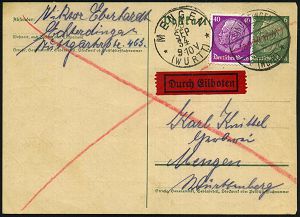3885 | 22 € | POSTLEITRAUM 7000 (OHNE STUTTGART) : SINDELFINGEN/ *(Württ.)* 1934 (28.9.) 1K-Brücke auf Inl.-P. 6 Pf. Hindenbg. + 40 Pf. Hindenbg. (Mi.524) klar gest. Fern-Eil-Karte n. Mengen, vs. AS. (Mi.P 226) | ![]() | |