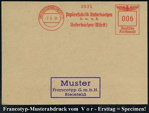 3906 | 35 € | POSTLEITRAUM 7000 (OHNE STUTTGART) : UNTERKOCHEN (WÜRTT)/ Papierfabrik Unterkochen/ GmbH.. 1938 (2.5.) AFS-Musterabdruck Francotyp "Reichsadler" , glasklar gest. Francotyp-Musterblatt vom V o r - Ersttag! (mit Attest), selten! (Dü.E-5CGh) | ![]() ![]() | |