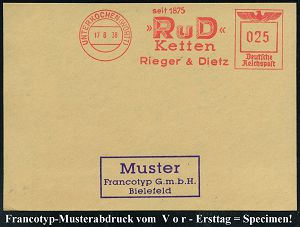 3907 | 35 € | POSTLEITRAUM 7000 (OHNE STUTTGART) : UNTERKOCHEN (WÜRTT)/ seit 1875/ RuD/ Ketten/ Rieger & Dietz 1938 (17.8.) AFS-Musterabdruck Francotyp "Reichsadler" , glasklar gest. Francotyp-Musterblatt vom V o r - Ersttag! (mit Attest), selten! (Dü.E-5CGo) | ![]() ![]() | |