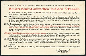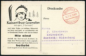3910 | 18 € | POSTLEITRAUM 7000 (OHNE STUTTGART) : WAIBLINGEN/ 3 RPf./ Gebühr bezahlt 1928 (16.3.) 1K-Brücken PFS auf Reklame-Kt.: Kaiser´s Brust-Caramellen (Skiläuferin) rs. Reklametext (Dü.A-6, Nr.25) | ![]() ![]() | |