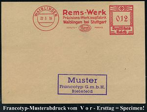 3912 | 35 € | POSTLEITRAUM 7000 (OHNE STUTTGART) : WAIBLINGEN/ Rems-Werk/ Präzisions-Werkzeugfabrik.. 1935 (22.3.) AFS-Musterabdruck Francotyp "Hakenkreuz" (Firmen-Logo) glasklar gest. Francotyp-Musterblatt vom V o r - Ersttag! (mit Attest), selten! (Dü.E-3CEo) | ![]() ![]() | |