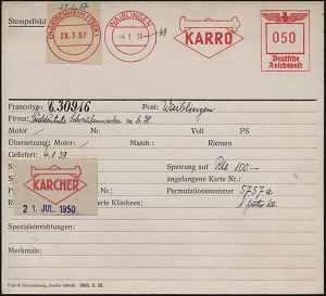 3913 | 45 € | POSTLEITRAUM 7000 (OHNE STUTTGART) : WAIBLINGEN/ KARRO 1939 (4.1.) AFS Archivmuster "Reichsadler" 050 Pf. vom E r s t t a g auf Archivkarte m. Maschinen-Nr. C 30916 + geänderter Orts-2K: (14a) LIRCHHEIM (TECK) von 1957 + weiteres Klischee: KARCHER, seltenes U n i k a t ! (Dü.E-5CGo) | ![]() | |