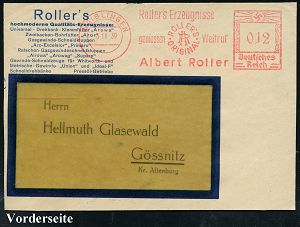 3915 | 14 € | POSTLEITRAUM 7000 (OHNE STUTTGART) : WAIBLINGEN/ Roller´s Erzeugnisse/ geniessen Weltruf/ Albert Roller 1939 (8.11.) AFS Francotyp "Hakenkreuz" (Firmen-Monogramm) Reklame-Vorderseite mit Produktaufzählung (Drehbank-Zubehör etc.) (Dü.E-3CEo) | ![]() | |