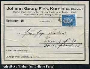 3815 | 20 € | POSTLEITRAUM 7000 (OHNE STUTTGART) : KORNTAL 1932 schw. Päckchen-1L ohne Datum auf EF 25 Pf. Hindenbg. a. Adreßaufkleber: Joh. Georg Fink.. naturreine Heil-u. Nährmittel (Knitter) seltene Verwendung! = 3. Gew.Stufe Brief! (Mi.416 EF + 7.- EUR) | ![]() | |