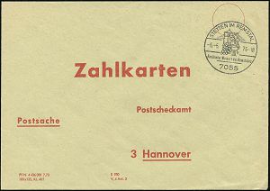 3904 | 16 € | POSTLEITRAUM 7000 (OHNE STUTTGART) : 7055 STETTEN IM REMSTAL/ Berühmter Weinort.. 1976 HWSt (Weinpokal, -Traube etc.) auf seltenem PSch-Innendienst-Bf. "Zahlkarten" (braun/grün) für Zahlkartenaustausch!, seltene Verwendung! (Bo.1) | ![]() | |