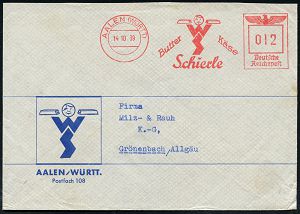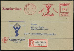 3745 | 28 € | POSTLEITRAUM 7000 (OHNE STUTTGART) : AALEN (WÜRTT)/ Butter Käse/ Schierle 1944 (9.8.) AFS Francotyp "Reichsadler" 042 Pf. (Comic-Figur mit Produkten) mit zugestempelter PLGZ (14) + RZ: Aalen (Württ), motivgl. Firmen-Reklame-R-Bf.! (Dü.E-5CG) | ![]() | |
