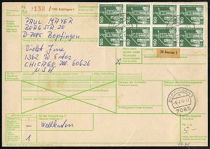 3773 | 18 € | POSTLEITRAUM 7000 (OHNE STUTTGART) : 7085 BOPFINGEN 1/ b 1976 (9.7.) 1K-Segment auf 8er-Block 160 Pf. Technik: Hochofenanlage, wie MeF (vs. u.weitere rs.) + brauner Paketzettel: 7085 Bopfingen 1, = 1670 Pf.-Frankatur auf Übersee-Paketkt. n.USA (Mi.10x 993 vs./rs. u.a.) | ![]() ![]() | |
