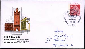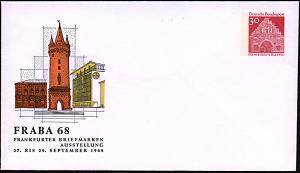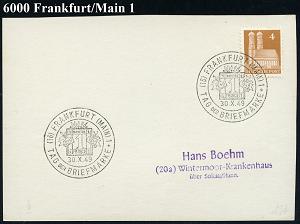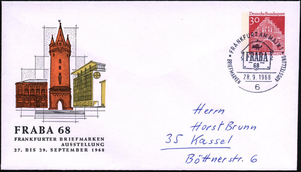 170 | 23 € | 6 Frankfurt/Main Sonder- und Handwerbestempel : Frankfurt/ Main 1968 PU 30 Pf. Bauwerke, rot: FRABA 68.. = Eschenheimer Turm, BAYER-Haus etc., je ungebr. bzw. mit Ausstellungs-SSt. FRABA = histor. Briefkasten (Einzelverkauf möglich: ungebr.: 12.- EUR, SSt.: 15.-) 2 Belege (Mi.PU 33/14) | ![]() ![]() | |