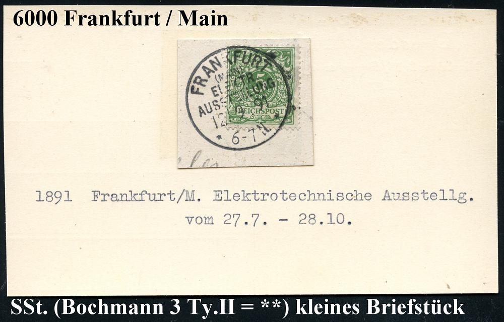 92 | 23 € | 6 Frankfurt/Main Sonder- und Handwerbestempel : FRANKFURT/ (MAIN)/ ELEKTR./ AUSSTELLUNG/ ** 1891 (12.9.) sehr seltener SSt , klar gest., kleines Briefstück (Bo.3 Ty.II = **) | ![]() | |