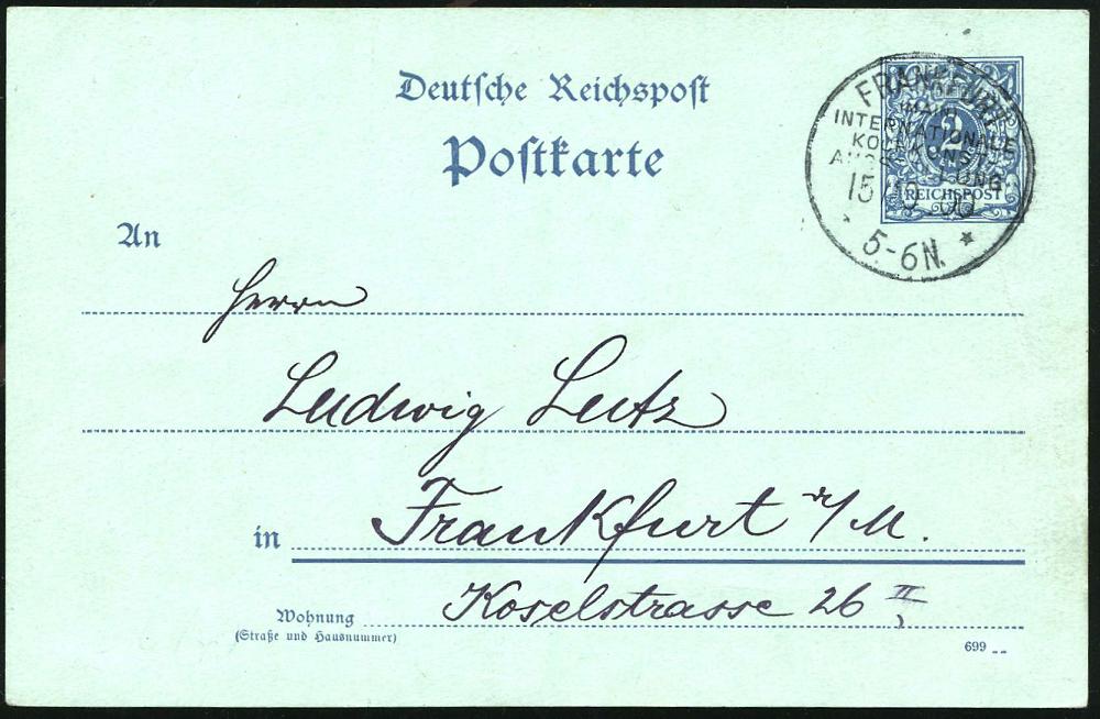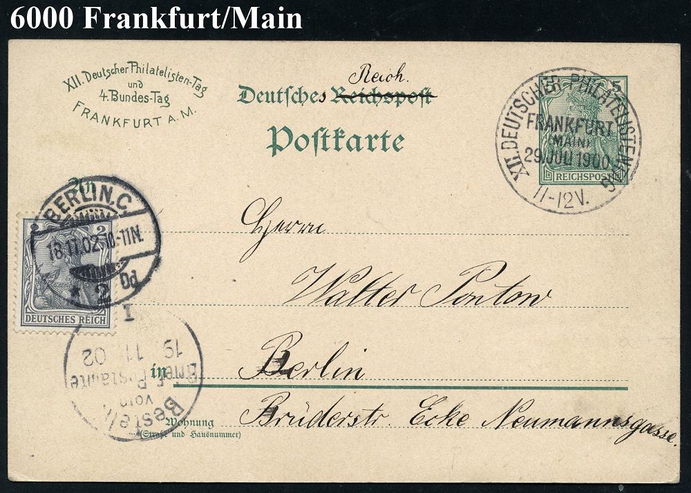 93 | 30 € | 6 Frankfurt/Main Sonder- und Handwerbestempel : FRANKFURT/ (MAIN)/ XII.DEUTSCHER PHILATELISTENTAG 1900 (29.7.) SSt 2x auf Inl.-P. 2 Pf. Ziffer + Zusatz-Frankatur (AS), portorichtig (Bo.8) | ![]() | |