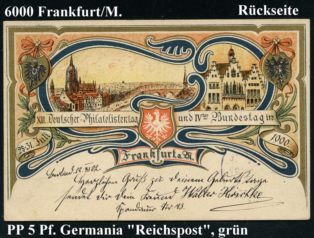 94 | 45 € | 6 Frankfurt/Main Sonder- und Handwerbestempel : FRANKFURT/ (MAIN)/ XII.DEUTSCHER PHILATEL.TAG 1900 (29.7.) SSt auf passender PP 5 Pf. Germania, grün: XII. Deutscher Philatel.-Tag und 4. Bundes-Tag = Rathaus "Römer" = Kaiserkrönungsstätte, Kaiser-Dom u. Altstadt, Alte Brücke etc. (Mi.PP 15/C 5-01) seltene Bedarfs-Karte (Bo.8) | ![]() ![]() | |