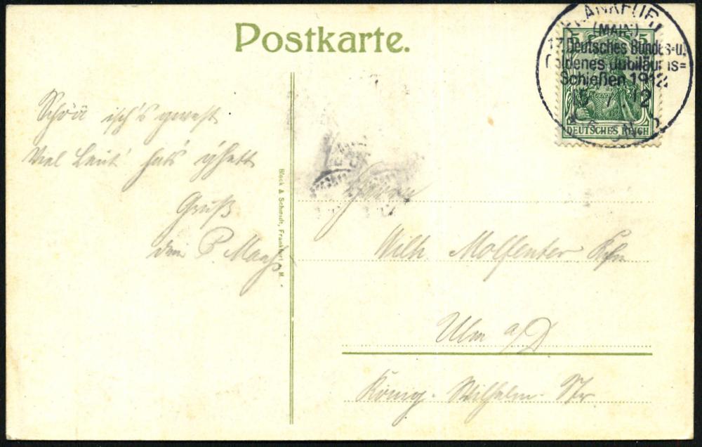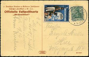 103 | 40 € | 6 Frankfurt/Main Sonder- und Handwerbestempel : FRANKFURT/ (MAIN)/ 17.Deutsches Bundes-u./ Goldenes Jubil.-/ Schießen/ *b 1912 (28.7.) seltener SSt auf offiz. Jubil.-Vignette (napoleon. Soldaten mit Trommel) offiz. Festpostkarte (Alt-Frankfurt im Flaggenschmuck) Bedarf! (Bo.20 Ty.III = * b) | ![]() ![]() | |