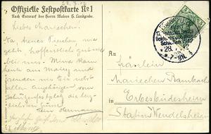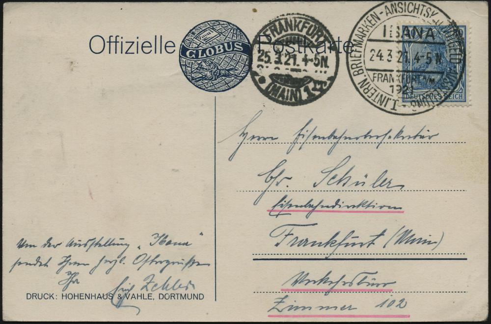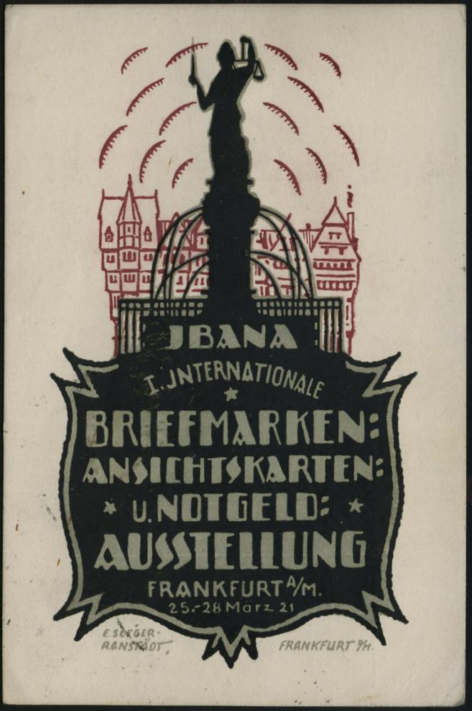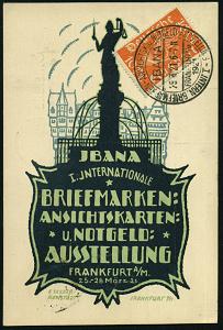 104 | 38 € | 6 Frankfurt/Main Sonder- und Handwerbestempel : FRANKFURTA-M/ IBANA/ I.INTERN.BRIEFMARKEN-ANSICHTSK.u.NOTGELD-AUSSTELLUNG 1921 (24.3.) seltener SSt klar auf Color-Sonder-Kt.: JBANA.. (braun / flieder / schwarz, sign.E. Seeger) Bedarf (Bo.26) | ![]() ![]() | |