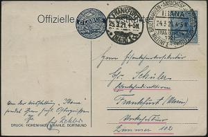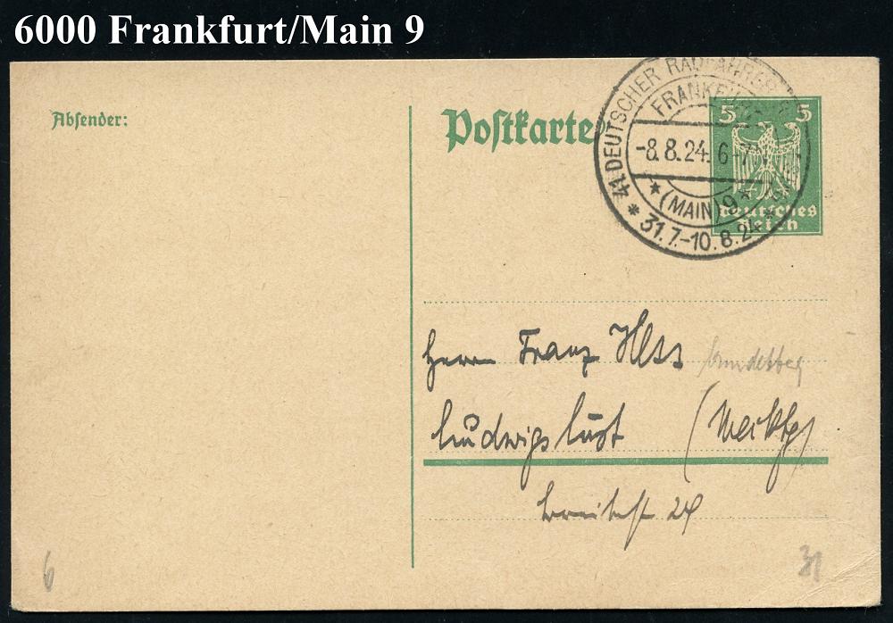 107 | 25 € | 6 Frankfurt/Main Sonder- und Handwerbestempel : FRANKFURT/ *(MAIN)9*/ 41.DEUTSCHER RADFAHRER-BUNDESTAG 1924 (8.8.) seltener SSt (rechts oben gering undeutl.) Inl.-Karte (Bo.31) | ![]() | |