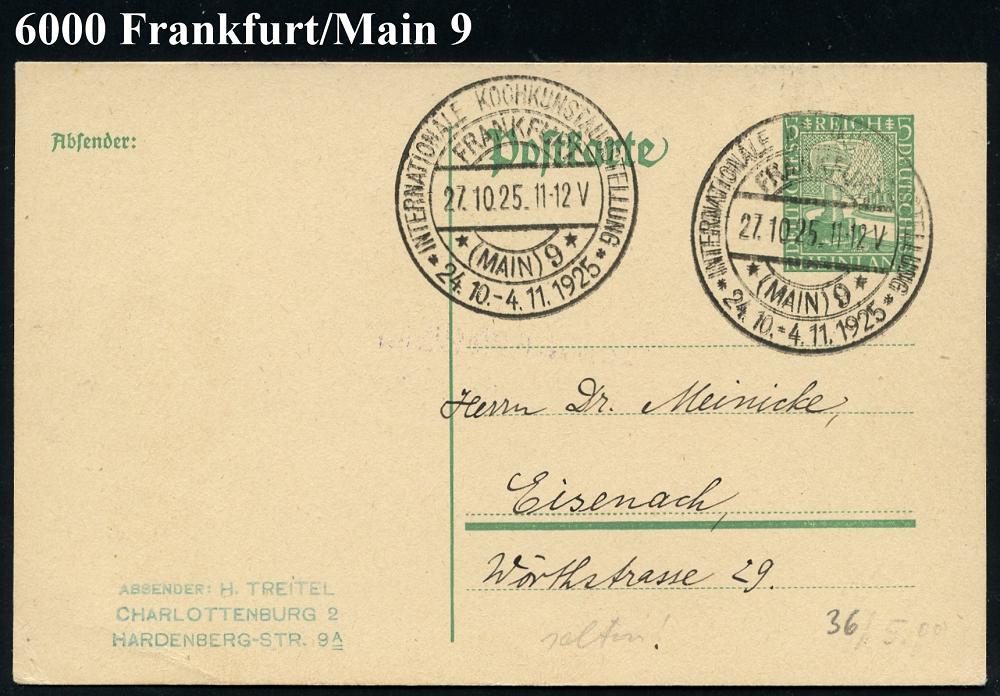 108 | 25 € | 6 Frankfurt/Main Sonder- und Handwerbestempel : FRANKFURT/ *(MAIN)9*/ INTERNAT.KOCHKUNSTAUSSTELLUNG/ 24.10.-4.11. 1925 (27.10.) seltener SSt klar auf Inl.-P. 5 Pf. Rheinland (Bo.36) | ![]() | |