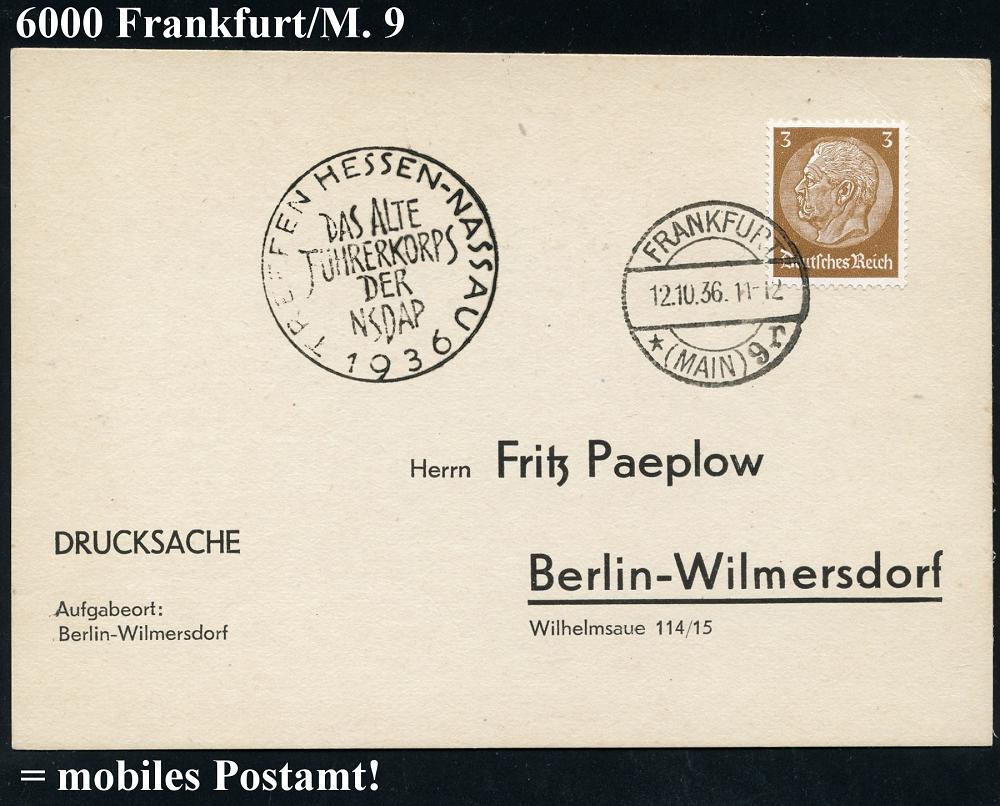 111 | 18 € | 6 Frankfurt/Main Sonder- und Handwerbestempel : FRANKFURT/ *(MAIN)9/ r 1936 (12.10.) 1K-Brücke + amtl. 1K-HdN: DAS ALTE/FÜHRERKORPS/DER/NSDAP/TREFFEN HESSEN-NASSAU = mobiles P.A., klar gest. Inl.-Kt. (Bo.1) | ![]() | |