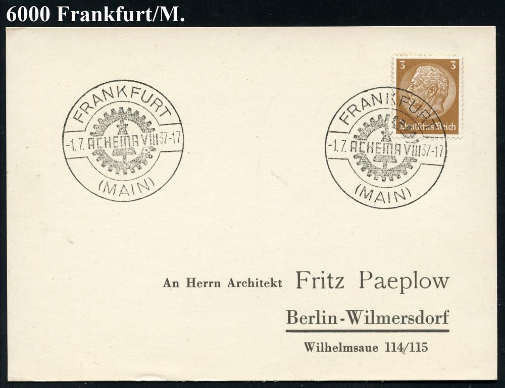 114 | 15 € | 6 Frankfurt/Main Sonder- und Handwerbestempel : FRANKFURT/ (MAIN)/ ACHEMA VIII 1937 (1.7.) SSt (Zahnrad mit Glaskolben) klar gest. Inl.-Drs.-Karte (Bo.76) | ![]() | |