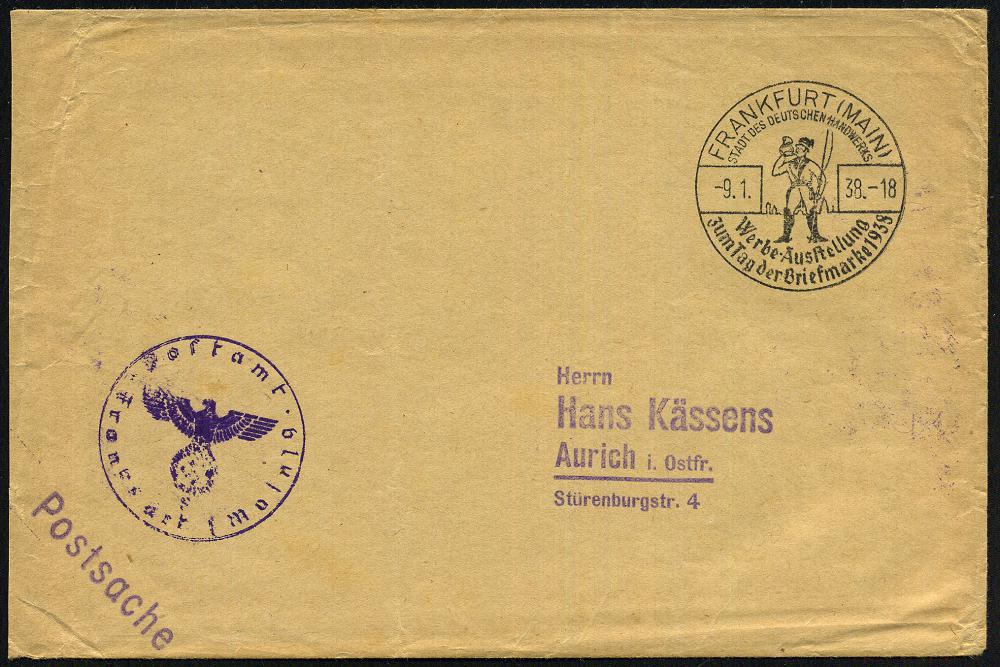129 | 10 € | 6 Frankfurt/Main Sonder- und Handwerbestempel : FRANKFURT (MAIN)/ Tag der Briefmarke/ RdPh 1939 (8.1.) SSt + viol. 1K-HdN: Postamt/l2/Frankfurt (Main) 9 klar auf Postdienst-Vorderseite (Bo.94) | ![]() | |