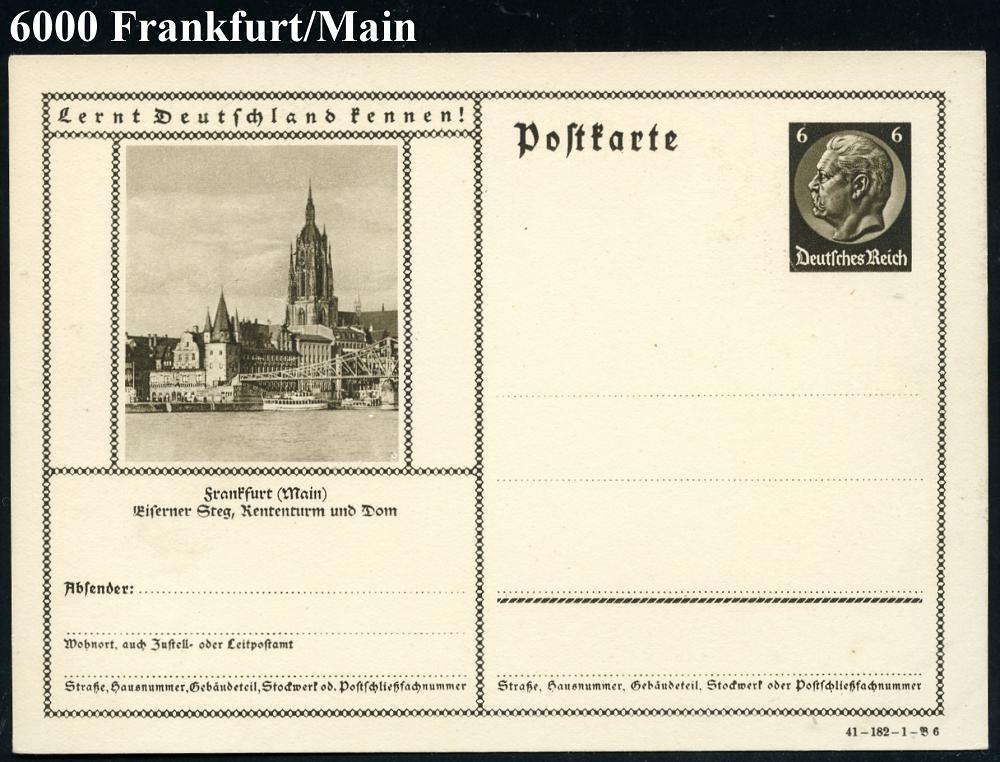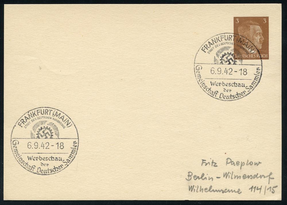 136 | 18 € | 6 Frankfurt/Main Sonder- und Handwerbestempel : FRANKFURT (MAIN)/ SDDH/ Werbeschau/ der/ GDS 1942 (6.9.) SSt = KdF-Logo (Hakenkreuz) auf PP 3 Pf. Hitler, braun (blanco Mi.PP 152/A 1-02) Inl.-Karte (Bo.106) | ![]() | |