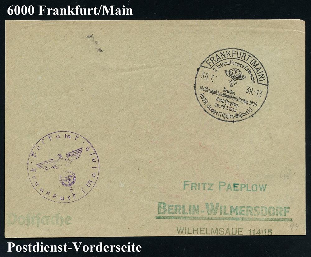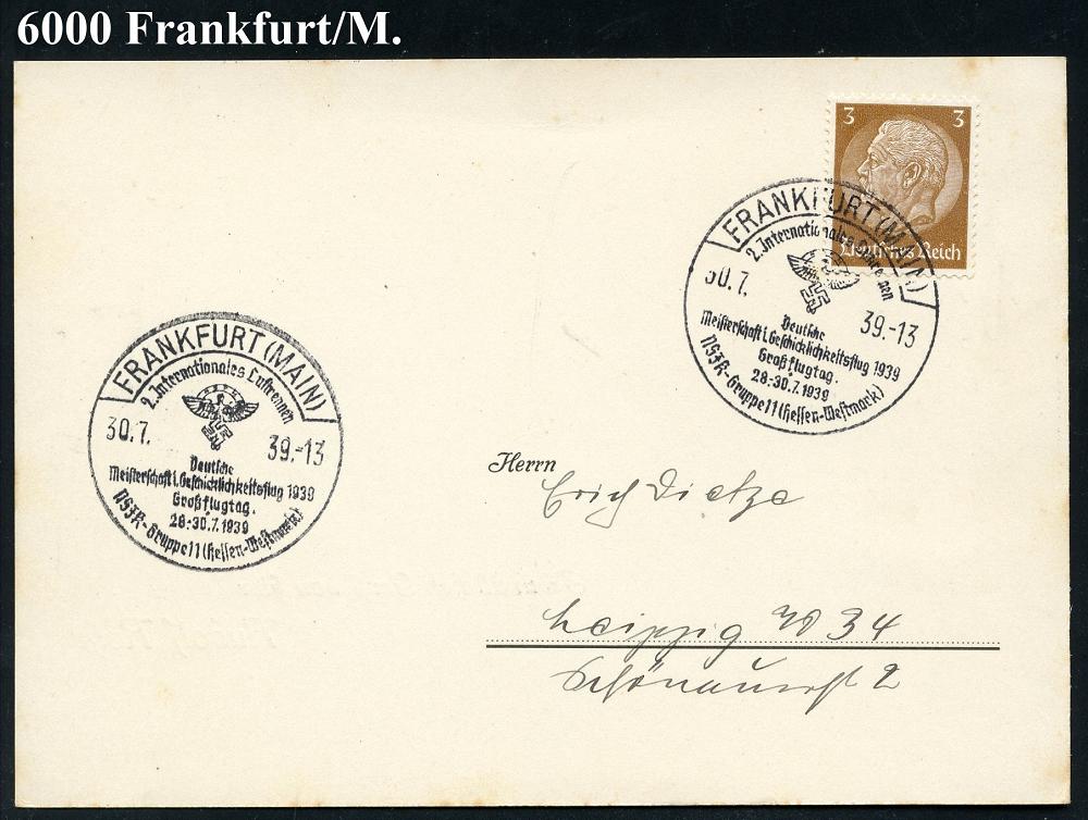 131 | 15 € | 6 Frankfurt/Main Sonder- und Handwerbestempel : FRANKFURT (MAIN)/ 2.Jnternat.Luftrennen/ Deutsche/ Meisterschaft i.Geschicklichkeitsflug 1939/ Großflugtag../ NSFK.. 1939 (30.7.) seltener SSt = NSFK-Logo mit Ikarus u. Hakenkreuz + viol. 1K-HdN: Postamt/l2/Frankfurt (Main) 9, klar gest. Postdienst-Vorderseite (Bo.98) | ![]() | |