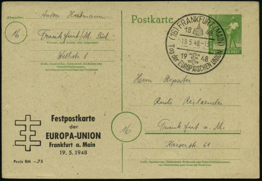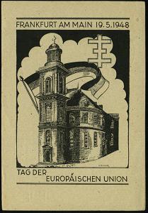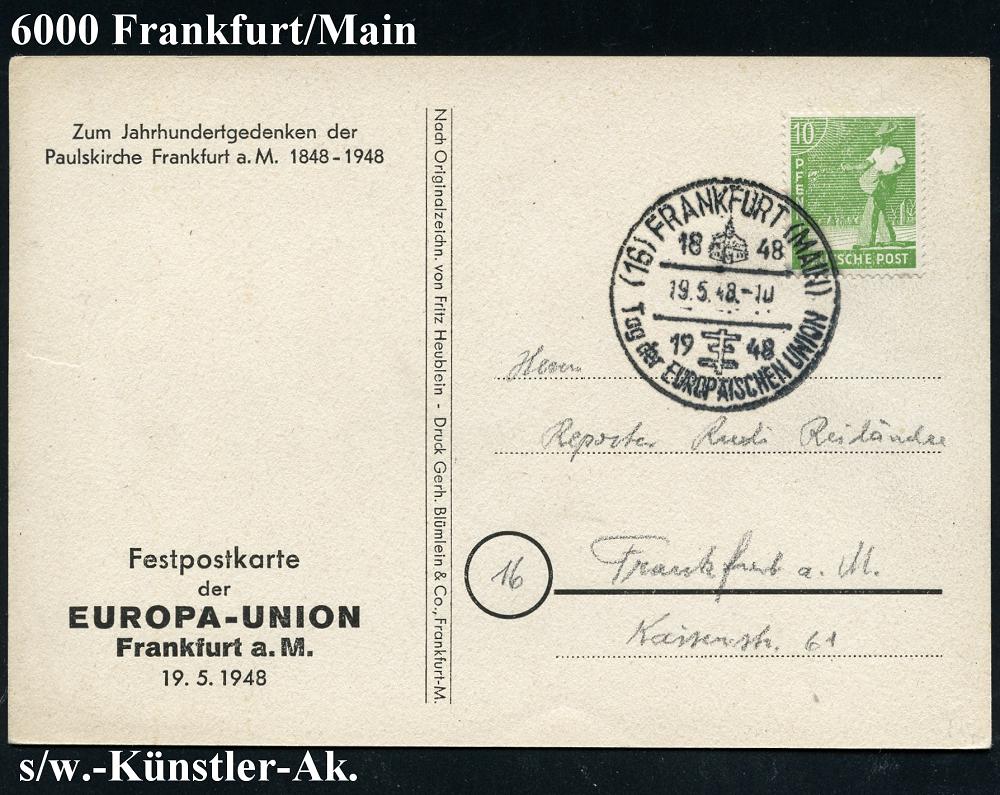 139 | 30 € | 6 Frankfurt/Main Sonder- und Handwerbestempel : (16) FRANKFURT (MAIN)/ Tag der EUROP.UNION 1948 (19.5.) SSt auf Orts-P 10 Pf. Arbeiter, grün + Zudruck: TAG DER EUROP. UNION = Paulskirche, Flagge, Europa-Kreuz (ME.PZD 4 / Michaelis Nr.4 a, + 60.- DM, 1991) klar gest. , seltene Ortskt. (Bo.117) | ![]() ![]() | |