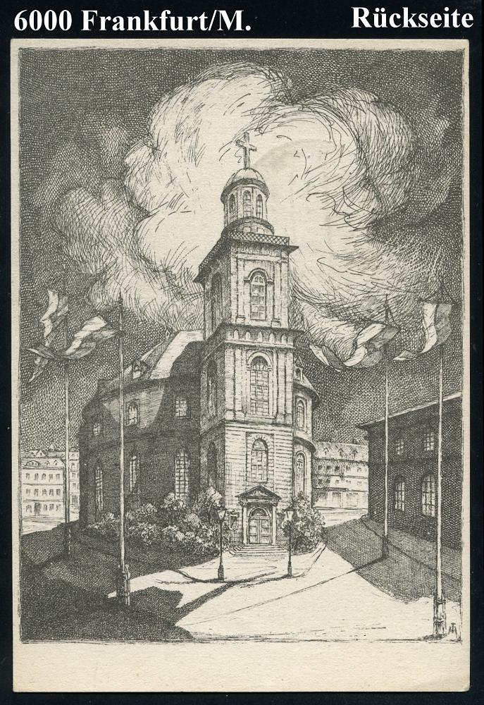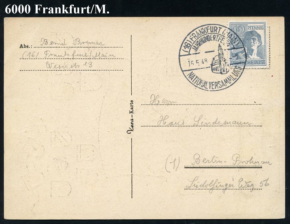 138 | 25 € | 6 Frankfurt/Main Sonder- und Handwerbestempel : (16) FRANKFURT (MAIN)/ JAHRHUNDERTFEIER/ NAT.VERSAMMLUNG 1948 (18.5.) SSt = Paulskirche (Ort der National-Versammlung) seltene s/w.-Jubil.-Festpostkarte.. (Michealis Nr.2, + 50.-DM, 1991) Fernkarte (Bo.116) | ![]() ![]() | |
