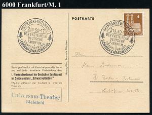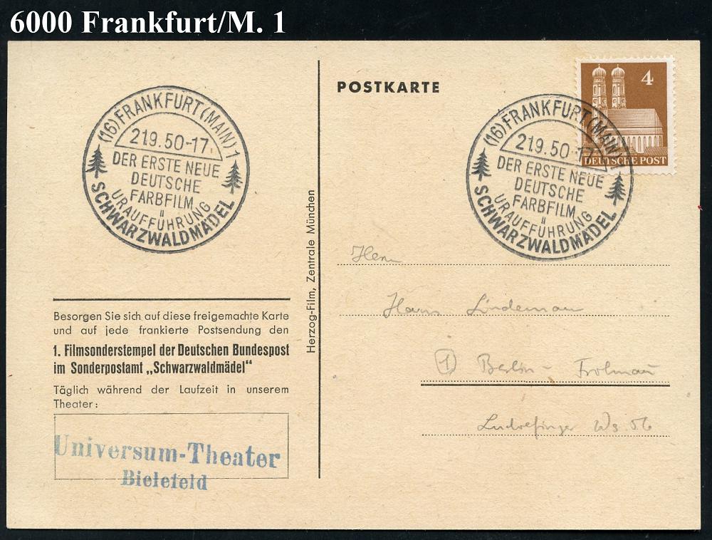 146 | 25 € | 6 Frankfurt/Main Sonder- und Handwerbestempel : (16) FRANKFURT (MAIN)1/ DER ERSTE NEUE/ DT/ FARBFILM/ URAUFFÜHRUNG/ SCHWARZWALDMÄDEL 1950 (21.9.) SSt (2 Tannen) auf passender Uraufführungs-Reklamekt. (Michaelis Nr.41, + 50.-DM, 1991) seltene Kombination! (Bo.138) | ![]() ![]() | |