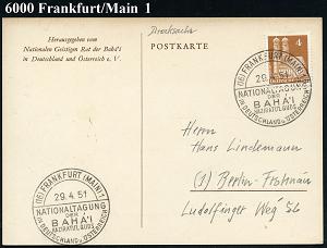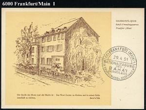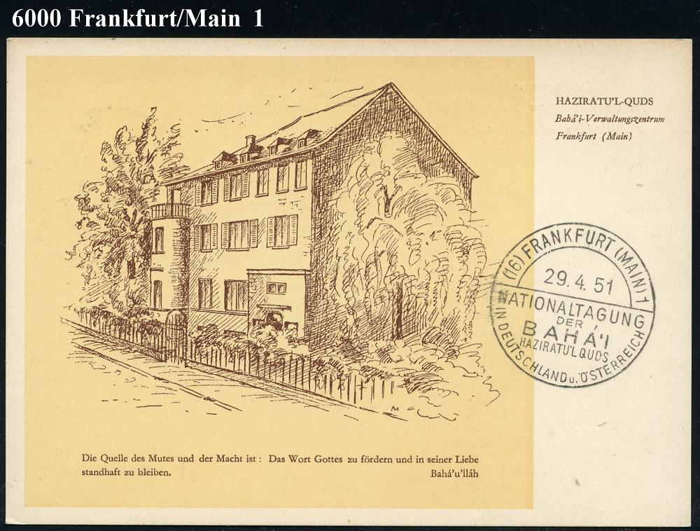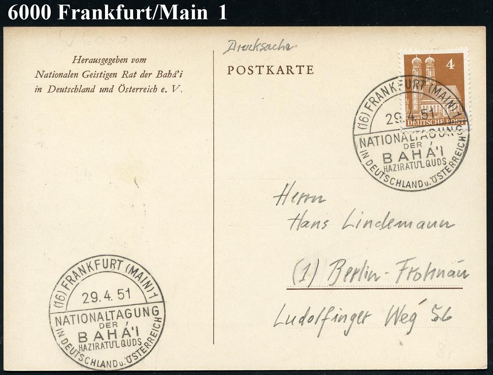 147 | 30 € | 6 Frankfurt/Main Sonder- und Handwerbestempel : (16) FRANKFURT (MAIN)1/ NATIONALTAGUNG/ DER/ BAHA´I/ HAZIRATU´L QUDS 1954 (2.5.) seltener SSt auf passender Sonder-Kt: Baha´i-Zentrum, Michaelis unbekannt ! (Bo.148) | ![]() ![]() | |