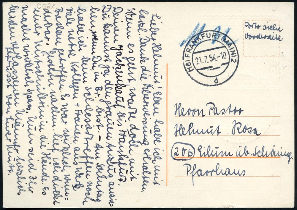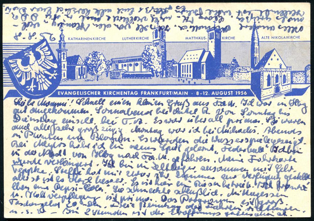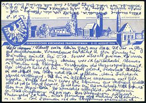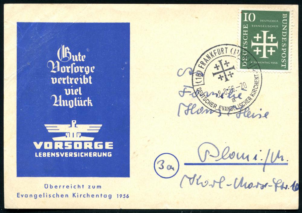 156 | 30 € | 6 Frankfurt/Main Sonder- und Handwerbestempel : (16) FRANKFURT (MAIN)/ a/ DEUTSCHER EVANGELISCHER KIRCHENTAG 1956 (8.8.) SSt = Jerusalem auf seltener Reklame-Kt.: VORSORGE LEBENSVERSICHERUNG überreicht zum Evangel. Kirchentag 1956 (Michaelis Nr.47 d, + 40.- DM, 1991) rs. Abb.: Frankfurter Kirchen, Bedarfs-Kt. mit viel Text, EF 10 Pf. Evangel. Kirchentag (Mi.235 EF) in die DDR (Bo.229 a) | ![]() ![]() | |