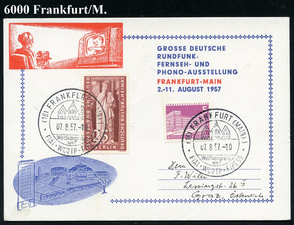 158 | 25 € | 6 Frankfurt/Main Sonder- und Handwerbestempel : (16) FRANKFURT (MAIN)1/ Weltkongress/ FIAI-WCOPT-FIPESO 1957 (7.8.) SSt = Rathaus "Römer" 2x klar auf Inl.-Sonder-Kt.: Gr. Deutsche Rundfunk-, Fernseh- u. Phono-Ausstellung, klar gest. Ausl.-Kt. (Bo.243) | ![]() | |