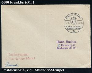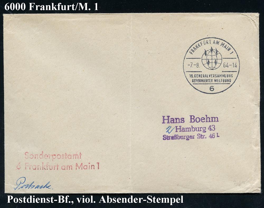 162 | 15 € | 6 Frankfurt/Main Sonder- und Handwerbestempel : 6 FRANKFURT AM MAIN 1/ 19.GENERALVERSAMMLUNG/ REFORMIERTER WELTBUND 1964 (7.8.) SSt (flammender Globus) + roter 2L: Sonderpostamt/6 Frankfurt am Main 1 (Bf. Mittelfalte) klar gest. Postdienst-Bf. (Bo.364) | ![]() | |