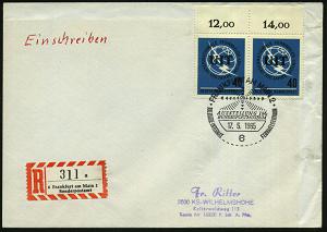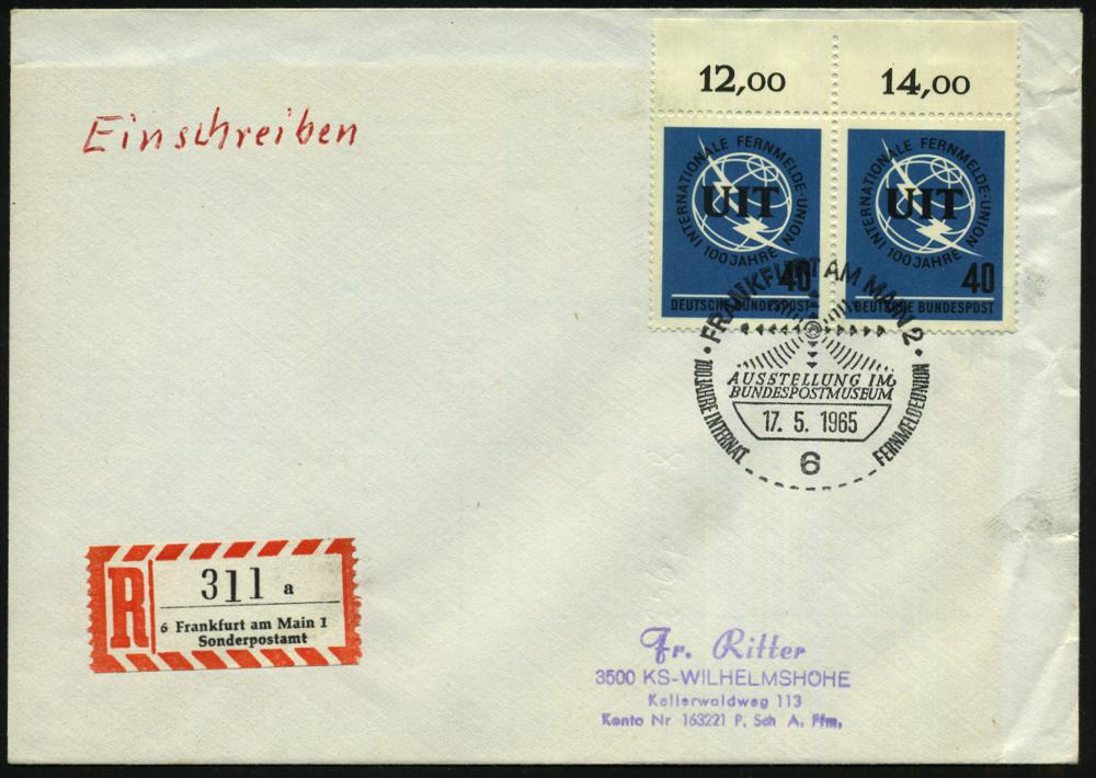 164 | 25 € | 6 Frankfurt/Main Sonder- und Handwerbestempel : 6 FRANKFURT AM MAIN 2/ AUSST./ BUNDESPOSTMUSEUM/ 100 JAHRE INt.FENMELDEUNION 1965 (17.5.) SSt auf Rand-Paar 40 Pf. UIT (Mi.476, MeF, + 25.-EUR) + Sonder-RZ: 6 Frankfurt am Main 1/a/ S o n d e r p o s t a m t , Inl.-R-Bf. (Bo.383 , nur 2 Tage!) | ![]() | |