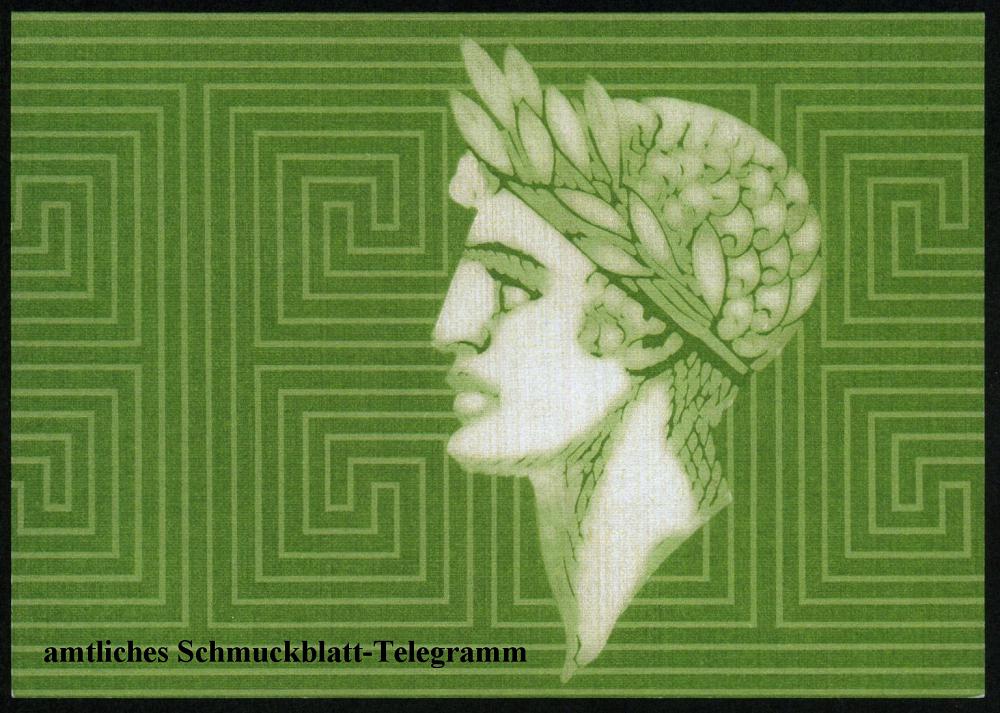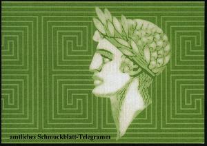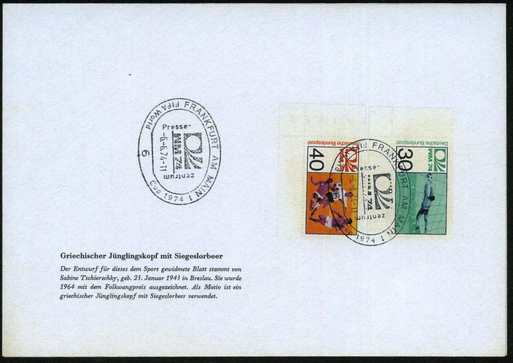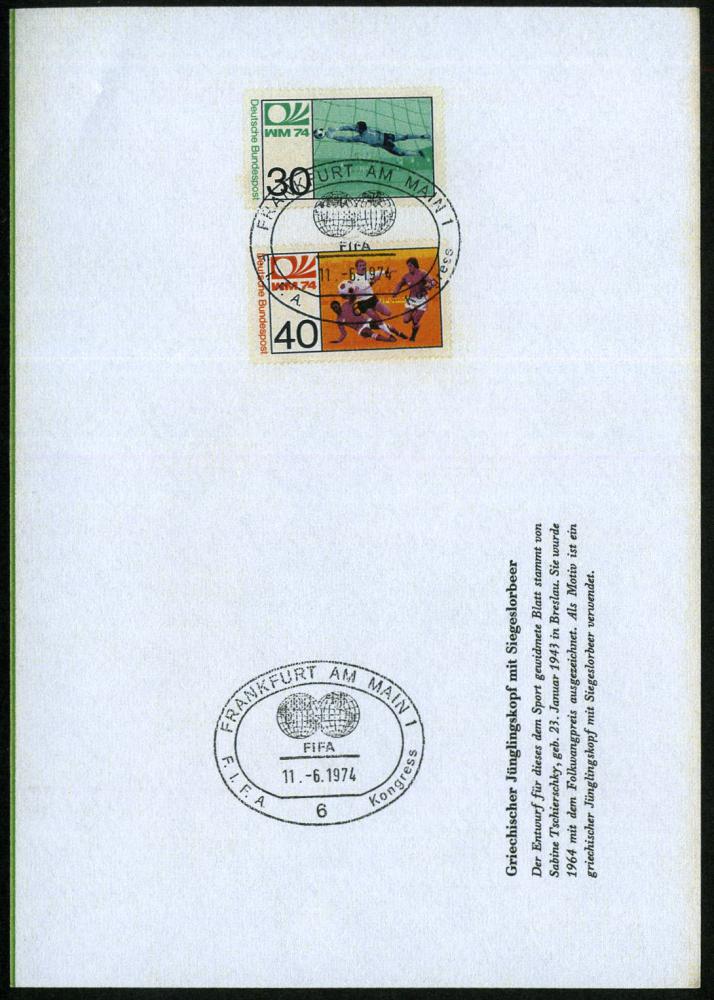 184 | 18 € | 6 Frankfurt/Main Sonder- und Handwerbestempel : 6 FRANKFURT AM MAIN 1/ FIFA/ F.I.F.A.Kongress 1974 (11.5.) SSt auf kompl. Satz Fußball-WM auf Schmuckblatt-Telegramm "Sport" (Griech. Jünglingskopf m. Siegeslorbeer) ungebr. (Mi.811/12) | ![]() ![]() | |