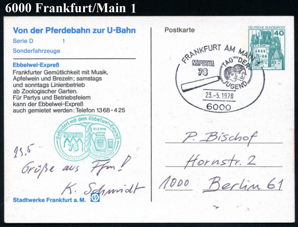 191 | 12 € | 6 Frankfurt/Main Sonder- und Handwerbestempel : Frankfurt a.M. 1978 (Mai) PP 40 Pf.Burgen: Ebbelwei-Expreß = Tram-Sonderwagen (mit Goethe-Portrait, Apfelweinkrüge etc.) + NAPOSTA-SSt., Fern-Kt. (Mi.PP100/6) | ![]() ![]() | |