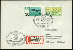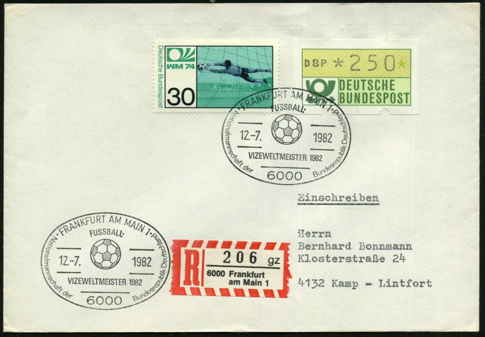 195 | 12 € | 6 Frankfurt/Main Sonder- und Handwerbestempel : 6000 FRANKFURT AM MAIN 1/ FUSSBALL-/ VIZEWELTMEISTER 1982.. 1982 (12.7.) SSt auf 30 Pf. Fußball-WM (Mi.811 u.a.) + ATM 250 Pf. + RZ: 6000 Frankfurt/am Main 1/ g z, Inl.-R-Bf. | ![]() | |
