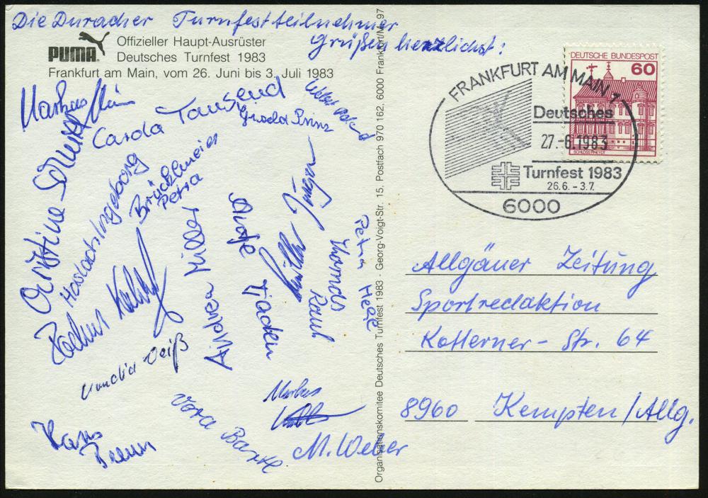 197 | 25 € | 6 Frankfurt/Main Sonder- und Handwerbestempel : 6000 FRANKFURT AM MAIN 1/ Deutsches/ Turnfest 1983 (27.6.) SSt auf Reklame-Kt.: puma Offiz. Haupt-Ausrüster Deutsches Turnfest 1983 (Firmen-Logo) mit zahllosen Teilnehmer-Autogrammen!, Bedarfs-Kt. | ![]() | |