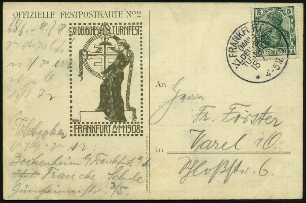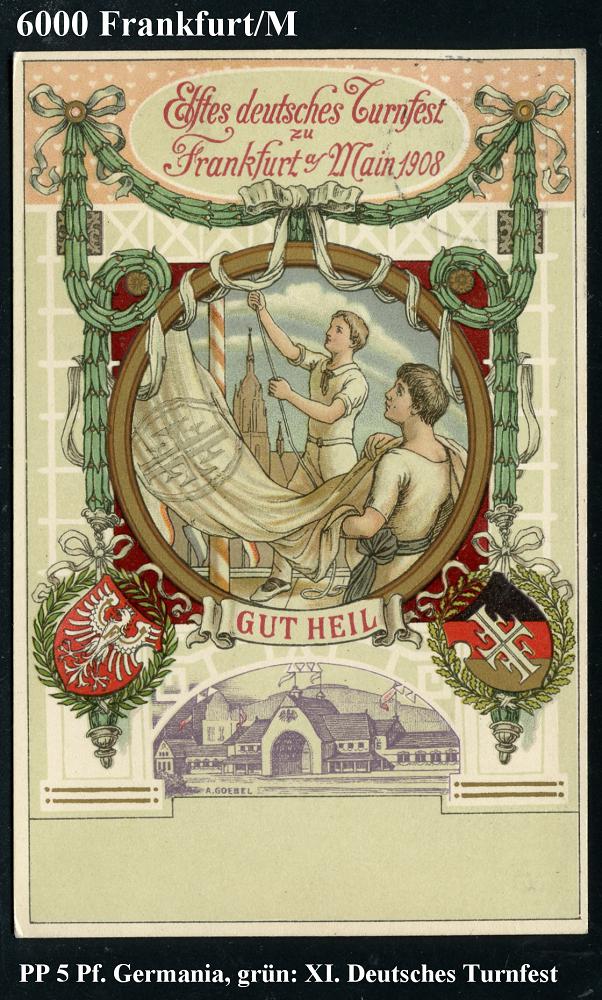 97 | 50 € | 6 Frankfurt/Main Sonder- und Handwerbestempel : FRANKFURT/ (MAIN)/ XI.DEUTSCHES/ TURNFEST/ ** 1908 (18.7.) SSt auf passender PP 5 Pf. Germania: OFFIZ. FEST-POSTKARTE No. 1 "GUT HEIL !" = Turner hissen Turnflagge "FFFF", Turnhalle, Wappen etc. (Mi.PP 23/C 84-02) glasklar gest. Inl.-Karte (Bo.16 Ty.II) | ![]() ![]() | |