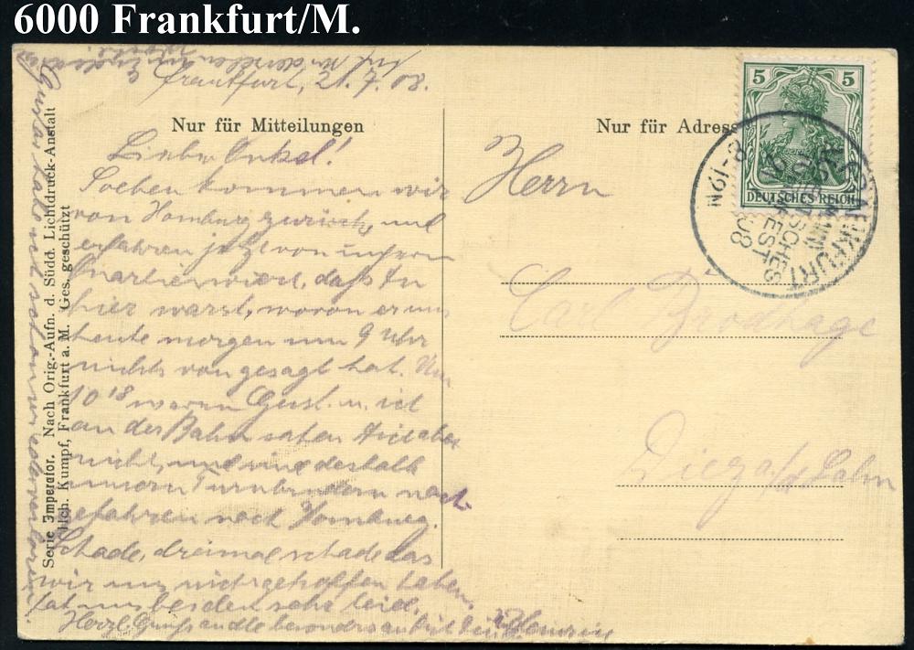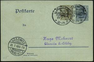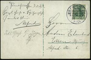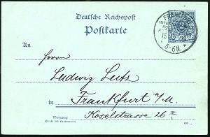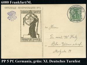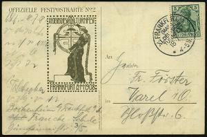 96 | 28 € | 6 Frankfurt/Main Sonder- und Handwerbestempel : FRANKFURT/ (MAIN)/ XI.DEUTSCHES/ TURNFEST/ *a 1908 (19.7.) SSt 2x klar auf Inl.-P. 3 Pf. + 2 Pf. Germania, Inl.-Kt. n. Gössnitz (Bo.16 , Type III = * a) | ![]() | |