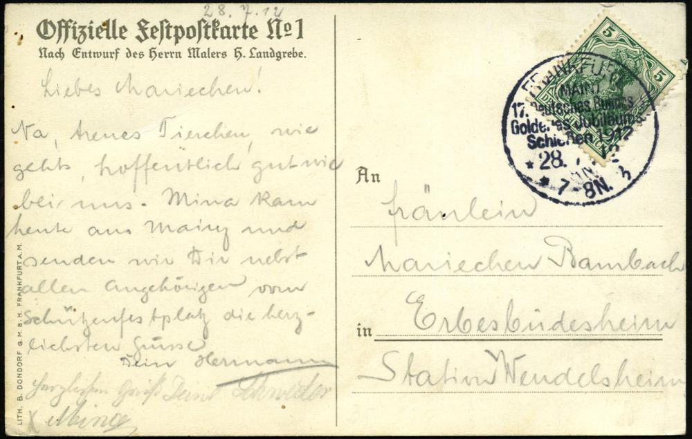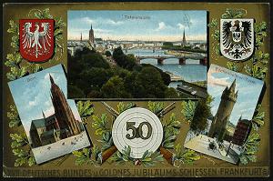 102 | 28 € | 6 Frankfurt/Main Sonder- und Handwerbestempel : FRANKFURT/ (MAIN)/ 17.Deutsches Bundes-u.Goldenes Jubil.-/ Schießen/ *b 1912 (25.7.) seltener SSt klar auf amtl. Festpost-Kt. Nr.1: Histor. Schütze 30jähr. Krieg, Dom u. Mainbrücke ,sign. Landgrebe (rs. stockfleckig) Bedarf (Bo.20 Type III = UB "b") | ![]() ![]() | |