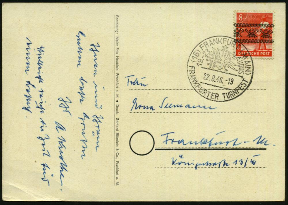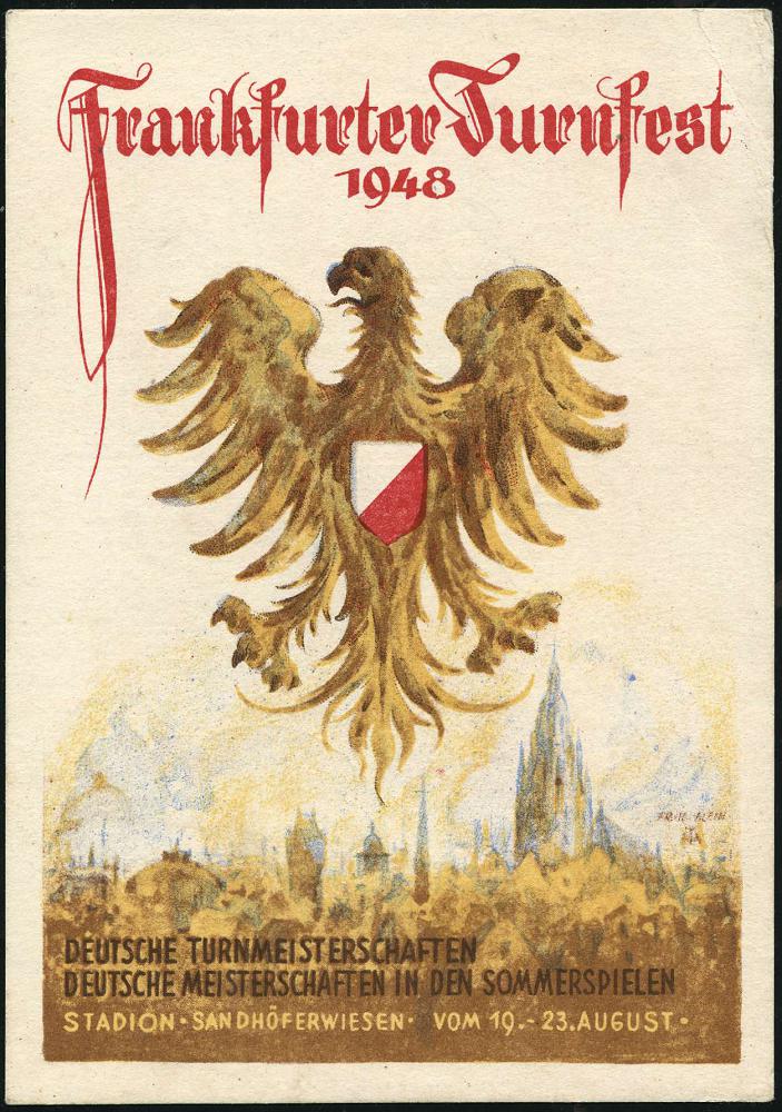 140 | 25 € | 6 Frankfurt/Main Sonder- und Handwerbestempel : (16) FRANKFURT (MAIN)/ FRANKFURTER TURNFEST 1948 (Aug.) SSt (FFFF, Adler) auf seltener Color-Sonderkarte (Michaelis Nr.5a, + 40.-DM, 1991) Bedarf (Bo.119) | ![]() ![]() | |