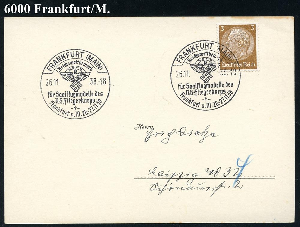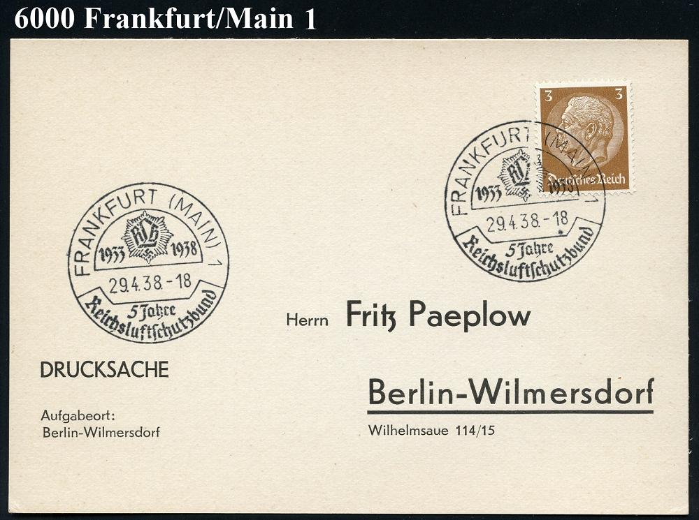 121 | 10 € | 6 Frankfurt/Main Sonder- und Handwerbestempel : FRANKFURT (MAIN)/ 1933 RLB 1938/ 5 Jahre/ Reichsluftschutzbund 1938 (29.4.) SSt (RLB-Logo mit Hakenkreuz) Inl.-Drs.-Karte (Bo.86, nur am 29.4.) | ![]() | |