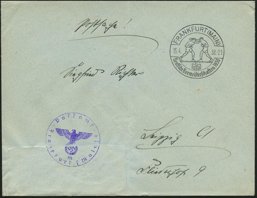 120 | 18 € | 6 Frankfurt/Main Sonder- und Handwerbestempel : FRANKFURT (MAIN)/ Deutsche Boxmeisterschaften 1938 (15.4.) SSt (2 Boxer) + viol. 1K-HdN: Postamt/m/ Frankfurt (Main) (Bf. schwache Mittelfalte) glasklar gest. Inl.-Postdienstbf. (Bo.84) | ![]() | |