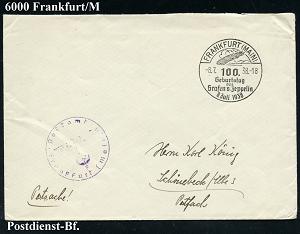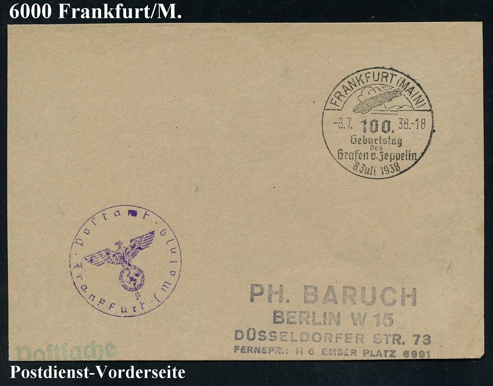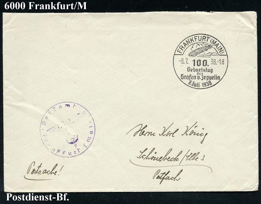 123 | 12 € | 6 Frankfurt/Main Sonder- und Handwerbestempel : FRANKFURT (MAIN)/ 100.Geburtstag/ des/ Grafen v.Zeppelin.. 1938 (8.7.) SSt = Zeppelin-Luftschiff + viol. 1K-HdN: Postamt/l2/Frankfurt (Main) 9 , Postdienst-Vorderseite (Bo.98) | ![]() | |