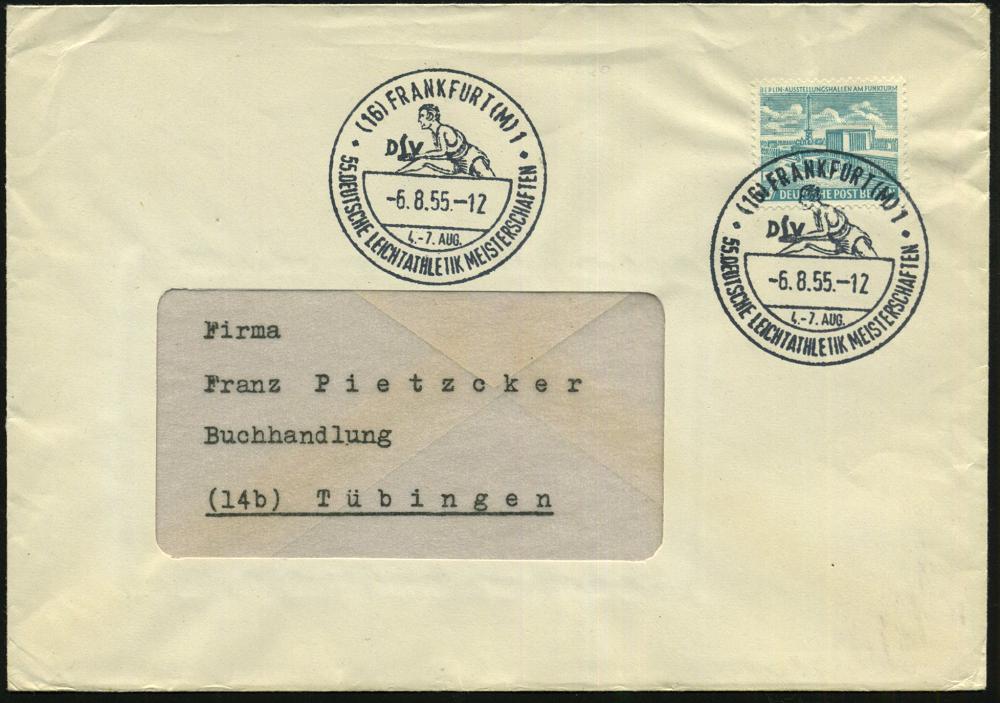 154 | 16 € | 6 Frankfurt/Main Sonder- und Handwerbestempel : (16) FRANKFURT (MA)1/ DLV/ 55.DEUTSCHE LEICHTATHLETIK MEISTERSCHAFTEN 1955 (6.8.) SSt = Hürdenläufer 2x klar auf Inl.-Bf. (Bo.221) | ![]() | |