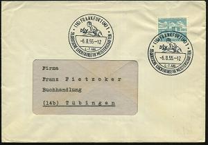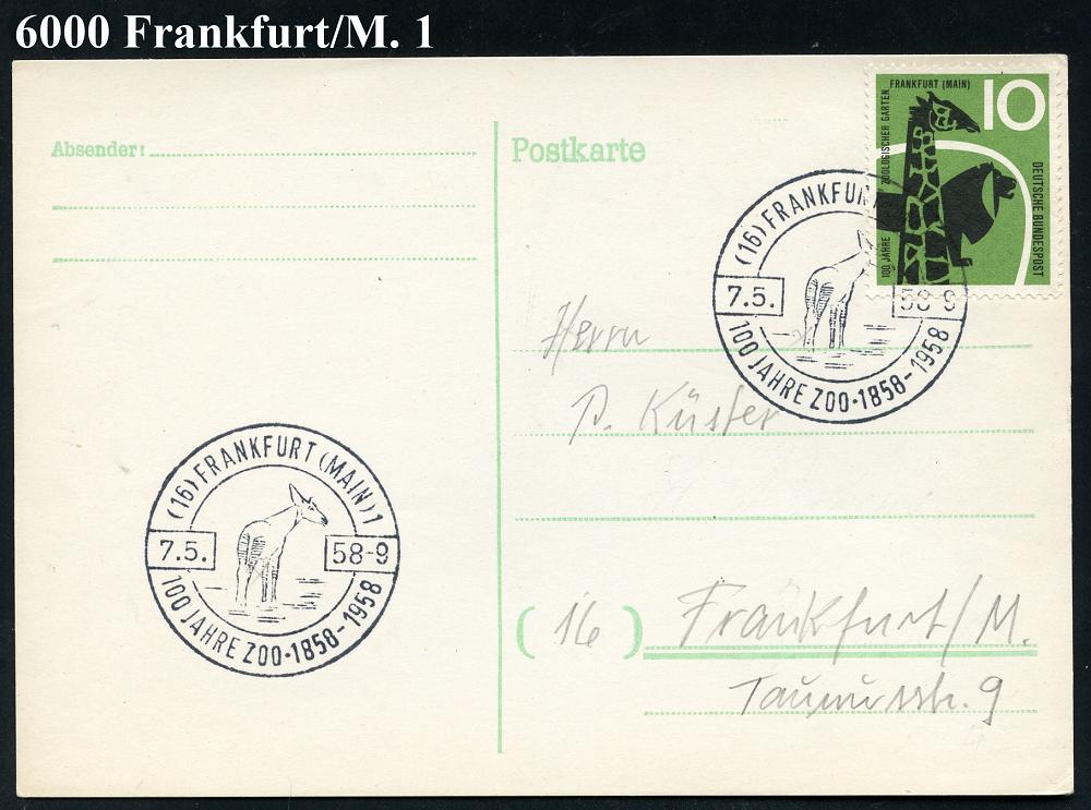 159 | 15 € | 6 Frankfurt/Main Sonder- und Handwerbestempel : (16) FRANKFURT (MAIN) 1/ 100 JAHRE ZOO 1958 (7.5.) SSt = Okapi auf EF 10 Pf. Zoo-Jubiläum (Mi. 288 = Giraffe, Löwe), Inl.-ET-Kt. (Bo.249) | ![]() | |