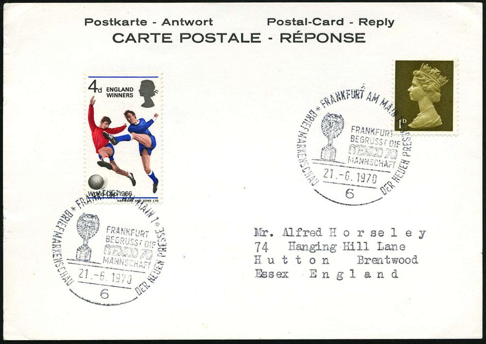 173 | 18 € | 6 Frankfurt/Main Sonder- und Handwerbestempel : 6 FRANKFURT AM MAIN 1/ FRANKFURT/ BEGRÜSST DIE/ MEXICO 70/ MANNSCHAFT.. 1970 (21.6.) SSt auf Groß-britannien. 4 d. WM´66 "World Cup" (Mi.429 u.a.) portorichtige, zulässige Ausl.-Antwortkt.n. England!, Unikat! (Bo.541) | ![]() | |