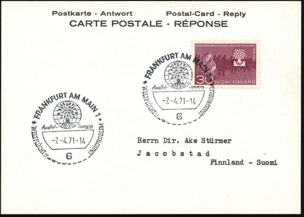 175 | 18 € | 6 Frankfurt/Main Sonder- und Handwerbestempel : 6 FRANKFURT AM MAIN 1/ Ausstellung/ WELTFLÜCHT-LINGSPROBLEM 1971 (7.4.) SSt (Baum-Logo) auf motivgl. EF Finlland "Weltflüchtlingsjahr" (Mi.517) zulässige Ausl.-Antwortkt. n. Finnland! Unikat! (Bo.559) | ![]() | |