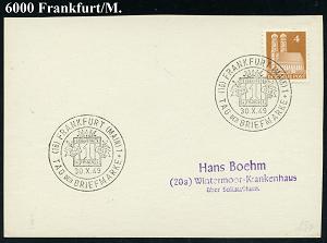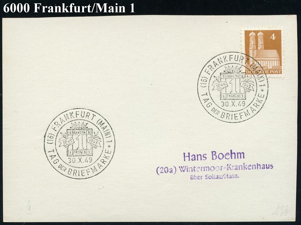 144 | 10 € | 6 Frankfurt/Main Sonder- und Handwerbestempel : (16) FRANKFURT (MAIN) 1/ TAG DER BRIEFMARKE 1949 (30.10.) SSt = Alt-Bayern 1 Kreuzer m klar gest. Inl.-Drs.-Karte (Bo.130) | ![]() | |
